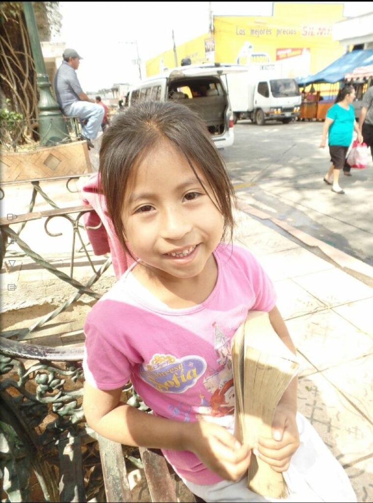 Her sweet, brown puppy eyes peer up from the gutter in the street near the park, or El Parque in Espanol (I’m pretty much fluent, except not really). I named her Franky and she has the demeanor of somewhere between that of an injured dear and a little baby lamb. She is resilient and joyful despite the hard life she has had. As I feed her a can of tuna from the Supermarcado (see…fluent) on the corner, a little girl walks by the bench where I sit. She is curious of me, the tall gringo in her city, and so I start a conversation with the limited Spanish I have acquired. I invite her to sit on the bench with me and my friends. Her eyes hold the same sweetness as that precious pup. I hand her my mango and we watch Franky eat while I ask the few conversational questions I have learned since being here in Xenacoj. There are long pauses. Then, I try new words and she says more back to me which I definitely don’t understand. I smile. She giggles. Then she says a phrase of which I catch only, “Quiero una Biblia.” YES!! This, I can do!