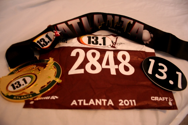 Sunday morning I woke up at 4:15 a.m. after a night of restless sleep and troubled dreams involving 13.1 miles of disaster. I ate half of a bagel with peanut butter and drank a protein shake praying that it would stay inside of my body for the next several hours. I stretched, put my shoes on and re-checked my bag for the umpteenth time to make sure that I had everything that I needed for the race. Then Becky and I drove down to Atlanta. We arrived at the course around 6:00 a.m., and I stretched again, trying to quiet my nerves and the doubts in my head that were competing with my adrenaline for my attention.