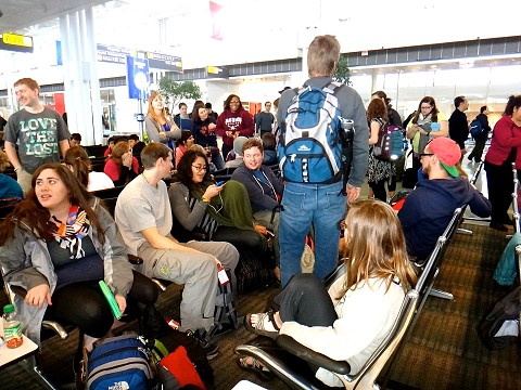 We all got full menus providing a variety of choices for each of the 3 courses and snack, (each course with a small dessert, and free wine and a selection of juices). The lights on the plane mimicked the time of day outside, changing from day to night to day again. Meanwhile all this, our 13 hour plane ride began. No one wanted to complain about our situation, however, 13 hours is a LONG flight. Little did we know our travel had only just begun.