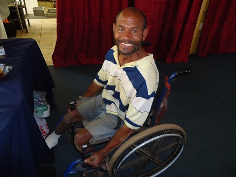 When I made my way back to where we were giving out soup and bread I began asking a lady that works here at Pop Up about Francis. She said that Francis is a sweet man and that it is sad because the people do not help him. They will allow him to struggle up the hill and she helps him a lot. She went on to say that Francis has to come back on Wednesday so that she may check his wound. He cut his foot on a piece of metal that was sticking out of the ground. He cannot walk, there for has to drag himself around when out of his wheel chair. He would also love to speak more but it's hard for him and difficult to understand his words.