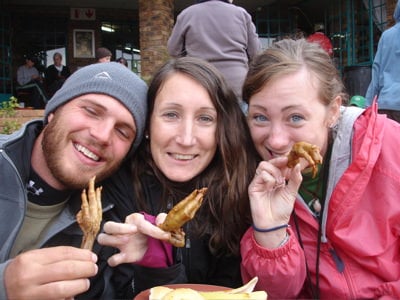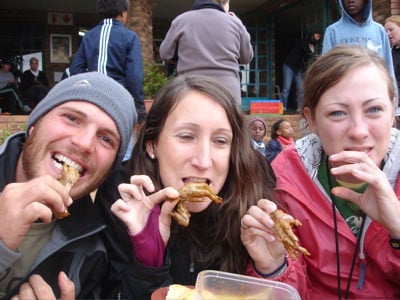 One of the girls in Esther’s group brought in a delicacy for us to try: “runaways.” What exactly are runaways, you might be asking? Chicken feet, including the toe nails. While I could have easily gotten out of trying this, I figured I needed to expand my horizons, so I dug in. As you can see, I was excited to try, but not too excited after gnawing on it for a bit. It didn’t taste bad, but it was pure fat/tendon. I wouldn’t do it again. We have been told that we will have a chance to eat fried worms during camp this week. I’m going to try them if they’re available! I kind of think it’s funny that I won’t even think about touching hotdogs/beans/mushrooms, but I will eat chicken feet and worms. Anything for a cultural experience, I suppose. I have a feeling Asia will bring some interesting delights…