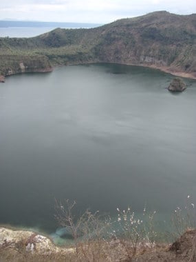 It wasn’t long before Pastor Ray returned and we were on our way to the volcano. He had found us tickets for 500 pisos, which is about $10. Not too bad. Now this is where our adventure begins…we were at the top of the mountain, needing to get down to the lake front, in order to take a boat across to the island where the volcano was located. Have you ever been on a Filipino road that winds down a mountainside? Well, if not, it’s a real treat. Half of us ended up getting car sick by the time we reached the bottom (I was thankful for my strong stomach, but still felt a little funny any way.) We literally were turning every minute, winding back and forth down the entire way, trying not to hit chickens, or other obstacles along the way. We reached the bottom and I saw our boat waiting for us. Now mind you, I can still be in my American mindset at times, and I was under the impression that one would take a ferry to get to an island where a volcano was located. That however, was not the case.