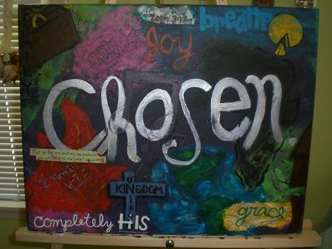 However, I can’t really put what I’ve learned into practical application and whip out an artistic masterpiece. The motivation is there, but the talent…well, that’s a different story. But Thursday I just knew that I needed to paint. I left my favorite coffee shop, where I’d been holed up all day, and went home. After taking inventory, I had a blank canvas, lots of paint, broushes, an easel, and a completely free schedule. The Lord really does provide!