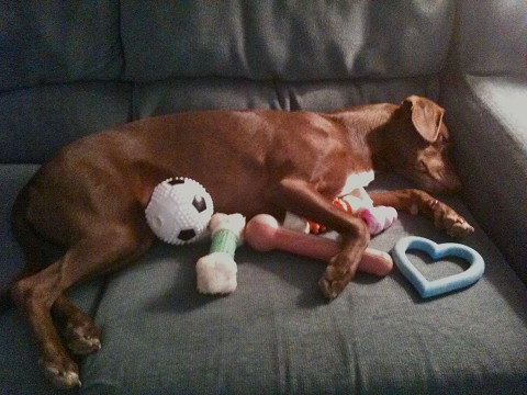 And lastly- funniest moment of the week. Actually it happened today. I came downstairs and Sal apparently wanted to take a nap so she gathered up all her toys to guard them while she slept. I guess she didn't want anyone else having fun while she was sleeping! SO funny. She's my favorite 🙂