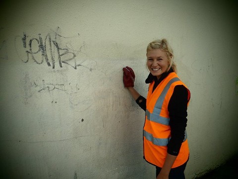 These orange vests made people ask a lot of questions about what we were doing and why… when they realized we were Americans it opened up even more of an opening to talk to people and share with them. This was a unique way of doing ministry in Galway for this very reason…we were serving and people were approaching us. Laura and I worked on this wall (below) for a couple that owned a butcher shop. They said no one had ever offered to anything for them for free. We got to share why were in Galway and just bless them by cleaning up their wall. While scrubbing the wall many people came up and talked to us. It was a really fun first day of ministry, and nice way of getting to know the city better. The owners even gave us some meat for breakfast as a gift:)