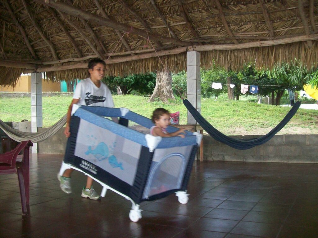 Jimmy pushing Dunia in her crib at the orphanage.