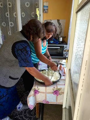 She gestures to us to sit in a collection of mismatched chairs next to a bowl of freshly washed grapes. Her neighbor Marika arrives and we give them the groceries. They are teaching us to make the traditional Bulgarian pastry banitsa. The ladies slip off their shoes to enter the kitchen—one table, a deep sink, and a toaster oven. Swift hands with ages of practice throw in a pinch of this and a dash of that. Our sweet friend Debbie translates the Bulgarian babbling as they describe each step in the process. It goes into the oven and we wait.