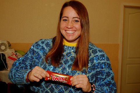 [Kathryn modeling an awesome sweater she found in a closet at the church, and displaying the fact that there are “coffee twix” in Ukraine…]