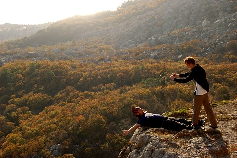 [David & our translator Pasha hanging off a cliff in Yalta]