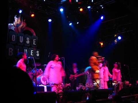 The top of the balcony opened up and cocktail napkins began to decend on us from everyone eating up stairs. (It was done on purpose). The gospel choir began singing and Erinn, Chelsea, and myself were up and dancing. I just can’t help but move when there is a beat. Ray (the lead singer) asked, “Are you here for a good time?” Then when we the audience responded with clapping Ray said, “Cause we are here for some God Time.” Then woots and clapping grew louder. And the song began: