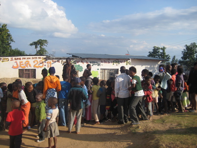 Daily feeding line at Partners in Harvest, Iris’s Ministries, starting with the youngest children to adults. Typical meals consist of mashed potatoes (powdered version), chicken fat, fish heads or corn mush. One day our team will join them to eat—but one clincher-in Africa they don’t use utensils!! I’ll let you know how that goes=)