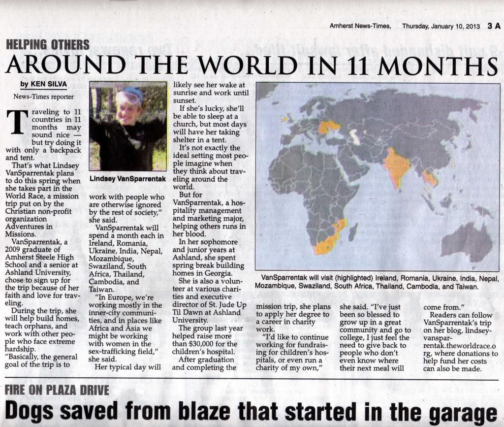 This is a very nice article that my hometown newspaper (The Amherst Newstimes) did on the World Race!