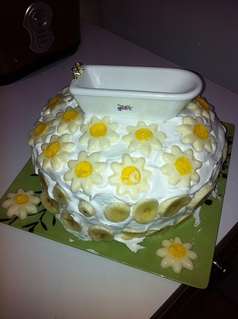 • Courtney made me a cake using my Meme’s banana/yellow cake recipe and put chocolate daisies on top with a bathtub just like the field on daisies with the random bathtub that we saw in New Zealand (World Race month 1).