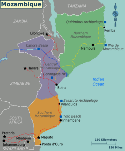 Mozambique is a country in southeast Africa. It is bordered by the Indian Ocean to the east, Tanzania to the north, Malawi and Zambia to the northwest, Zimbabwe to the west, and Swaziland and South Africa to the southwest. Mozambique is a former Portuguese colony that is seeing signs of redemption and economic recovery in spite of, the extreme poverty gripping the nation.