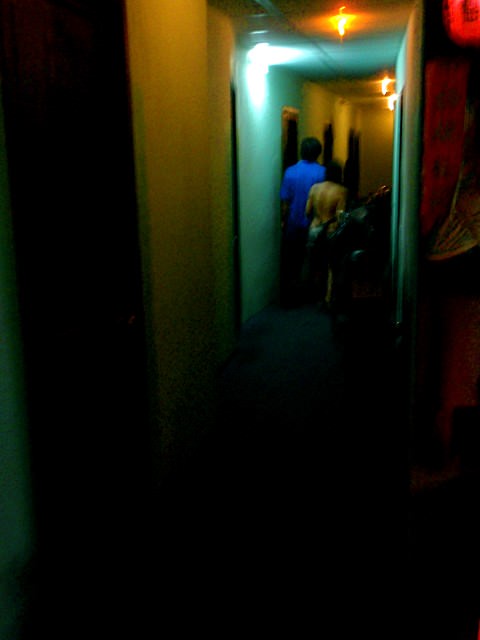 repetitive slaps of whips coming from the room at the end of the hall and I see