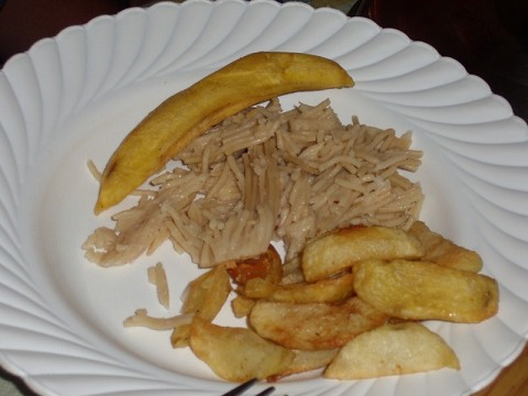 Boy, oh, boy, was I ever so wrong. The World Race is definitely not fat camp. There is not a lack of food or a lack of options. The only thing lacking is the physical activity and exercise. First, let me focus on the abundance of food and options. As has been my experience, every ministry contact has the assumption that Americans eat a lot, thus provide large amounts of food for each meal. Not to mention that these meals are more often than not carbs, starches, and more carbs. For instance, a meal consisting of fried bananas, pasta, and french fries (see below). Oh, and in Africa, everything is fried in a vat of oil. EVERYTHING! For one meal, we were literally served grease patties (see below). There was no substance but flecks of carrots – it was a patty of conjoined grease. No lie.