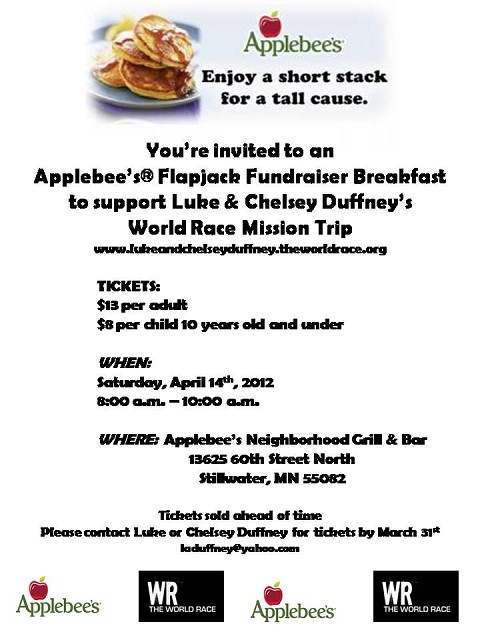 Chelsey and I are very proud to announce our upcoming fundraiser. It will be a pancake breakfast hosted by Applebee's restaurant in Stillwater, MN. Check out the flyer we created to find out more info about it. We would love to see everyone there. Enjoy some great breakfast and come support what God is doing with our trip!