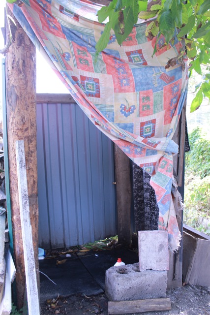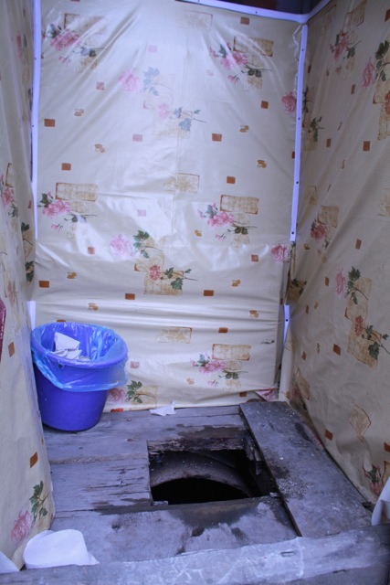 We have a squatty potty that eerily reminds us of the one from Slumdog Millionaire. You know, that wooden shack made of sketchy plywood that has a square hole? That one. It’s that kind of squatty. But there is cute floral tarp hanging on the walls to get it more of a homey feeling, which is rather nice.