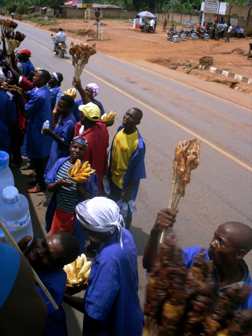 12:58pm: men running next to bus trying to sell us cooked meat on sticks, water, bananas, and chapatti through bus window- we do buy some water