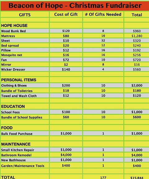 Below is a list of gifts that are needed.  Consider giving a gift to Beacon of Hope in honor of a friend of family member (names will be listed on the website as a thank you).