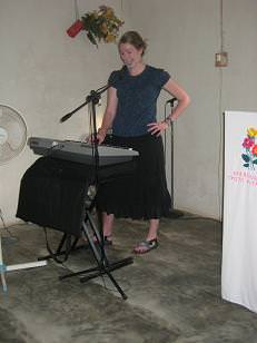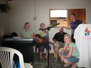 Our group has many talents, however, music is probably not one of our stronger suites. None the less, ministering at the local church means leading worship. I have quite a bit of musical background, though I would not say that I am proficient in any one instrument. However, playing the keyboard and singing lead voice has become my role as our unofficial team worship leader. Tara has uncovered her hidden talent in playing the guitar. Jessi is no longer a closet singer, while Zach has quite a bit of talent with the drums. Jes’s alto voice adds a nice balance to the mix, and there you have it, the Cinco Gringos, our band name.