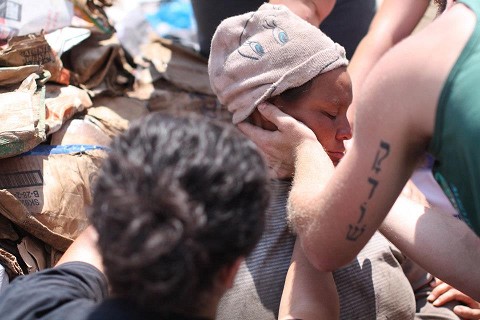 At one point I looked over to see Danae praying with a woman who was seven months pregnant. I was surprised to see tears rolling down her cheeks as it was the first emotion besides anger I had seen displayed in that desolate place. The scene caught my attention again a few moments later when I heard people yelling for Devin to come. Devin is an EMT on our squad. The lady had lost consciousness. I knelt down beside her and began to rub her arm as Devin checked her pulse. He stood up and announced, "Ok guys! Time to pray!"