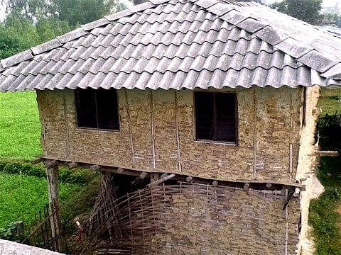 My house is made of wood slabs, straw, mud, straw, and newspaper.