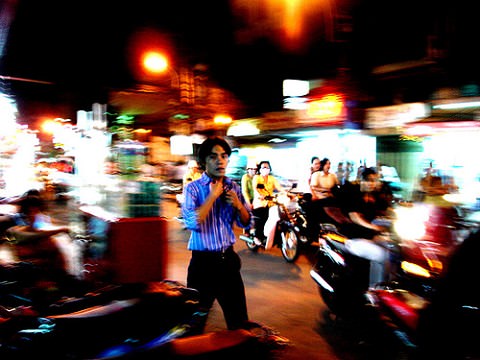 We are in Ho Chi Minh, Viet Nam. Entering at night, darkness is accompanied by harsh neon signs.  The crowded city is lined with tall buildings that enclose the streets. There is an unsettling echo of piercing horns and puttering engines as scooters, hundreds of them, zip close by in both directions. The air is heavy and unkind, harboring the stench that drifts from the countless hole in the wall kitchens.