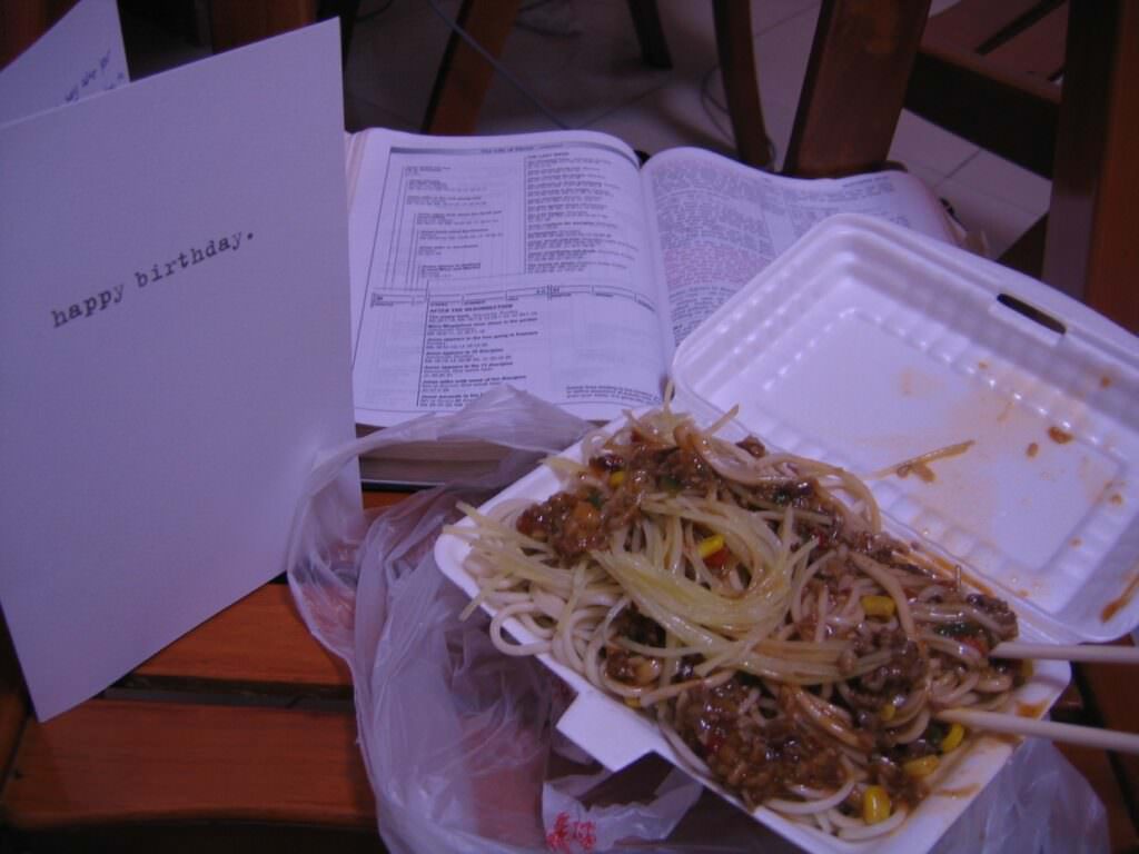 So on my way home I’m wondering what I should do with this insight since I’m feeling inspired to be in remembrance. Easter is Easter of course, but I don’t think I’ve ever given much thought to the actual last supper, except as it’s demonstration of communion. My first thought is to pick up some take out so I don’t spend the next hour cooking dinner, so I stop at my favorite restaurant. I checked the mail on the way up to my apartment, and sitting there is an envelope that for once isn’t covered in indecipherable Chinese characters that indicate another bill to be payed – it’s a personal letter! I sat down with Dad’s Word out so I could do some reading over dinner, got my food ready to be eaten, and opened the envelope. Inside was a birthday card from Sarah Burrows, fellow world racer and all around pro at making you feel loved. If you’ve never had the blessing of getting a word of encouragement from her, you’re missing out on years worth of warm fuzzy feelings.
