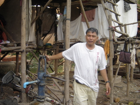 Pastor standing by well recently provided by the church