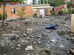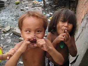 As we ride down the street the buildings go from tall nice looking to small and dumpy and back again in the space of a block or two. We are in a city and nation that is working to rebuild itself after so many years of war and neglect. As we pull up to the slum I didn’t realize we where there. I had pictured it similar to the squatter camps of Africa but this appeared to be nothing more than a few shacks in a lot between buildings. Looks can be deceiving. It turned out that what I was seeing was the entrance to a much larger area behind the buildings. When we walked into the slum we see people everywhere. As we work our way into the slum our guide stops to talk to everyone we see. He comes here every week to teach Bible study.