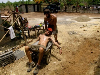Bust their butt doing construction. Over the past month we’ve busted out concrete, poured new concrete, dug trenches, laid out plumbing, built concrete block walls, sealed tile, landscaped, moved trees, all in the name of Jesus. We flex in the mirror, walk around with our shirts off, hit each other on the butt, talk sports, take showers with a hose even though there’s a nice shower inside, “break wind�, play cards, because we have “high testosterone and are grown men� as Austin would say.