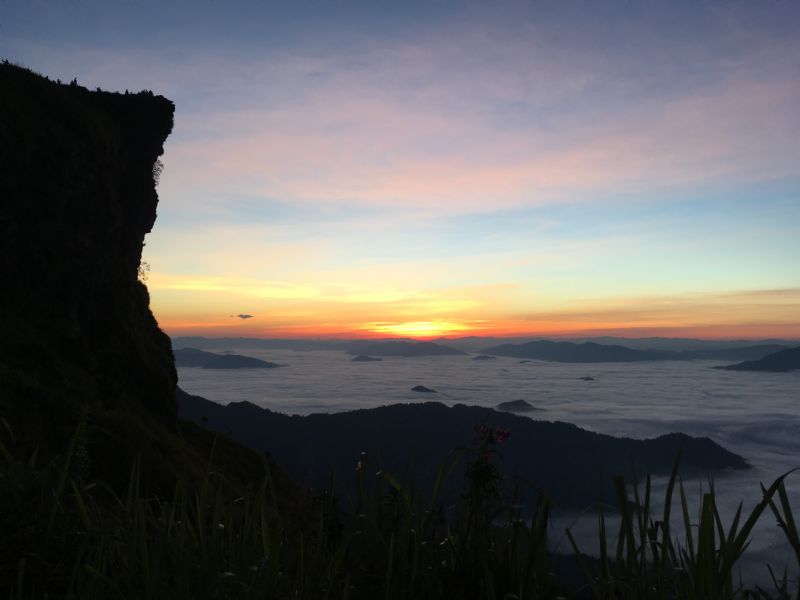 I watched a sunrise last weekend at Phu Chi Fa, a mountain in the middle of nowhere Thailand. Sitting with four beautiful people, I watched the world spin into light. It was breathtaking. I have seen many sunrises and sunsets, but there was something special about this one. There was an endless beauty every direction you looked. The clouds slithering around the mountains in the valley below had me looking for Jack Sparrow and the black pearl on their quest for gold. The sunlight illuminating the grass in front of me filled my spirit with awe. I saw beauty that can only be seen when God touches something. The whole world around and below and within us was simply praising its Creator. The grass could not seem to stop waving and praising Jesus. A purple flower and a bumblebee danced together glorifying their Creator. A cliff loomed above, jutting out as if reaching for the heavens. Once again, I got wrapped up in the expanding rainbow as it streamed more colors and light – the sign of His covenant displayed like it is every morning and every night. Neon colors I forgot existed pull at my heart. Only an hour before, it was pitch black except for the dim twinkle of the stars and stumbling feet led the way up the mountain. Now, the land was alive again with the dawn of a new day. Hills rolled upon hills with the horizon stretching as though wandering to the heavens. Strangers paused all around us to breathe in the moment and watch the magic happen. All our eyes were captivated by the magic of illumination as we caught our first glimpse of the ball of fire that we spin around. There it was, rising, just like we will at the end of age. I mean this sunrise was more stunning than most anything.