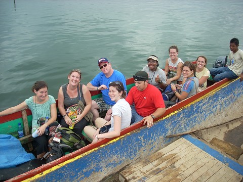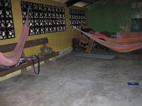 The island we were on had about 900 people living on it. To walk from on end to the other took probably five minutes at the most. Houses crammed next to one another with narrow walkways inbetween. No electricity, except for the light in the church is run by a generator-also they have solar powered lighing. Most, if not all of the homes, have hammocks that they sleep in. Tons of children everywhere you turn. One little store where they buy their main food staples for cooking and such. All day long the women would sit outside their houses making thier handy-crafts. They mostly make quilting squares, and beaded jewelry. They have about two months of tourist season when groups come through for tours, so in the meantime they make their crafts to sell when all the forigners come to visit. The men go out fishing durring the day to catch fish and other sea creatures for the meals for thier families. It was incredible to see the men come up to the shore with boats full of the largest and most beautiful crabs, lobsters and conch I have ever seen in my life!! Meanwhile all the children are in school from 8am to around 12pm. So this is the life on Kuna Yala. Very, very simple. Very laid back, and tranquil. Oddly enough this was the difficult part for me. It made me realize how busy my life has to be as an American. I feel like if I’m not up doing something or going somewhere then I am wasting the day away. But these people live and thrive off just being with eachother, and working on their handycrafts or fishing. This is how they live. Simple. This is how they prefer to live. By our American/Western standard we would say they are poor financialy. For them, they just see it as what they have always known, and I didn’t sence that they desired anything more. The islanders are one big family, and all they need and want are eachother. Some of them are Christians, and some aren’t. They all love and accept one another for who they are.