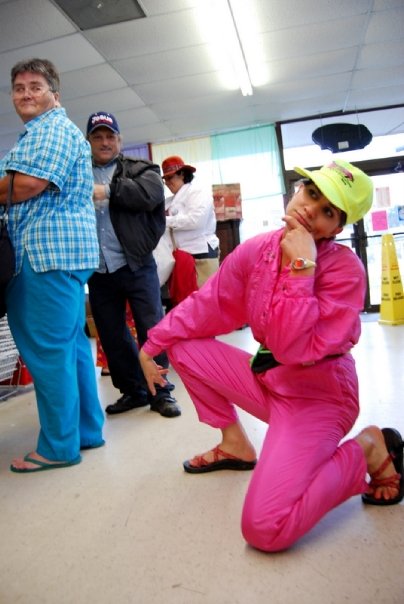 ~Sweet hot pink 80’s jump suit complemented with neon fanny pack and hat!
