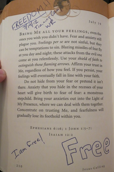 When I opened my Jesus Calling devotional for that day, July 19, 2012 I worshipped all over again.  Now I walk in the FREEDOM Christ died for, and not the weight of this world.