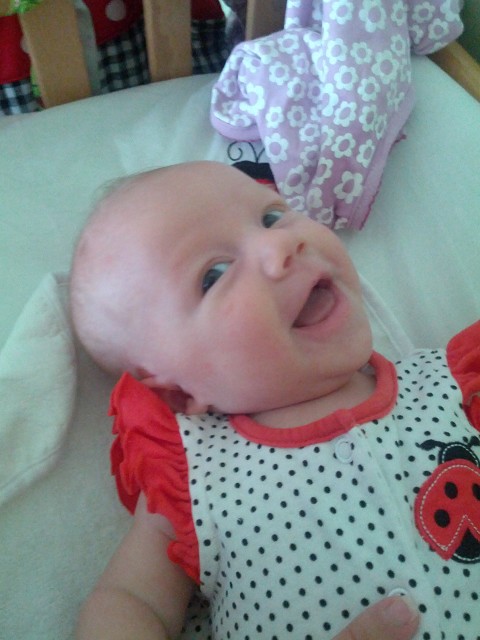 A friend and her husband from high school recently had a baby girl. Meet Abby!! Abby is 8 weeks old today! She is absolutely BEAUTIFUL!! I can’t believe how quickly she is growing up, all ready!! She is no longer a cuddle bug but has found her legs, toes and fingers and is a squirmy worm!! I had a talk with Abby the other night and told her she had to STOP growing and developing until I return home because I don’t want to miss anything. She pretty much ignored me, lol.