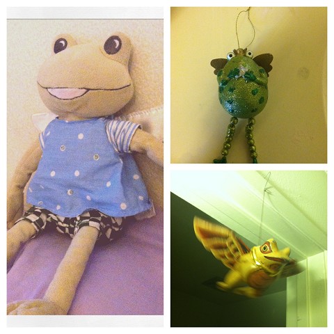 And wahlah. Insert inside joke. Insert eagle eyes to find a flying frog. And let me tell you. They are hard to find. The stuffed animal my mom found at Ikea. I cannot remember where the orange one came from- I think Jess gave it to me.