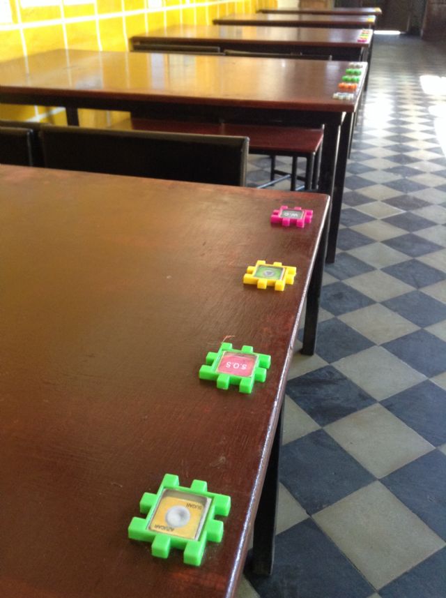Tables at the Café de las Sonrisas. These tables have puzzle pieces on them with labels (for the deaf), and they are placed in a particular order (for the blind). Each piece is used by the customer to communicate with their server when needing assistance. For example: “need a refill”, “check, please”, “sugar”.