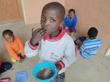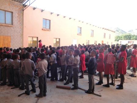 The students all lined up for morning assembly. Their school lunch (maizemeal and beans) are cooked over a fire so each child has to bring a piece of wood to school every.day.