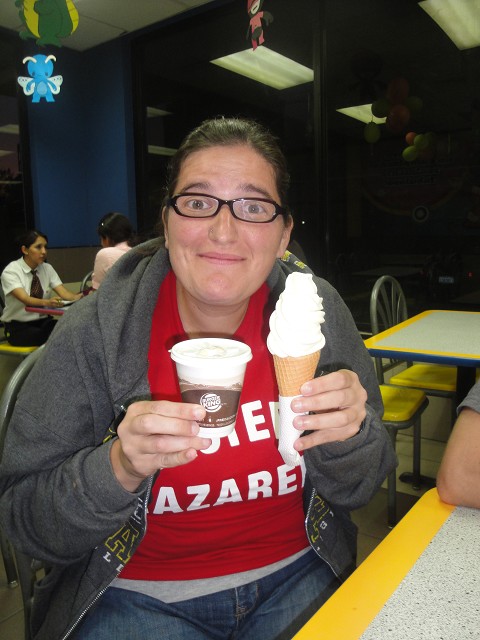 Below is me in Burger King. First, the coffee and ice cream cost me less than $2–awesome. Secondly the cone was twice the size of the coffee. Not awesome–it was super cold!