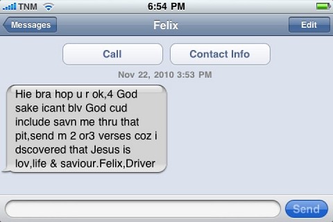 In retrospect, everything panned out the way God intended it, and I see glimpses of HIS amazing work. For example when the rolling ceased we landed right side up. That in itself is a blessing! Then as a team we worked so incredibly well, and this is grace that God has equipped us with. I knew Tommy was under the van, so I panicked to get out. Daniel lifted me out, and that’s when others realized where Tommy landed. With adrenaline pumping  Caleb, Daniel, and Juliette (who has a messed up arm) were able to push the van up, while I pulled him out. After that Caleb began calling everyone, and opened up the lines of communication. Were not even suppose to have phones on the race, but our team has three personal phones, which is a blessing, because our team phone had no minutes thus useless. My phone got passed around to call home, and surprisingly some of our families were heading to church. I had no idea what time it was back home, I had even forgotten that it was Sunday morning for them, but I called and asked them to pray. The Lord answers prayers, not one of our bones are broken!