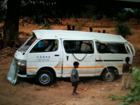 We quickly whip around on the road so that it seems like we are parked sideways on a two-lane road. One hand grips the seat in front of me, and the other is placed on the roof to help stabilize me, because I knew the next thing to take place when a fast moving vehicle is skidding would be a roll. I was positioned on the right side of the bus, next to the window on the very last seat; literally sitting on top of the tire that busted during our drive. I yell some inaudible words like “oh no, here we go” and thus begins the rolling. The first thought that came to my mind was “God help us and the second thought  “Don’t fall out” The first roll took place on the street, my window busted on impact along with the trunk window behind me. That’s when the pack next to me flew out the window. Next to the road was a huge ditch, which was a stimulus to keep our bus rolling. During the second roll, Tommy flew out the window, he was sitting next to me on the left side of the bus.