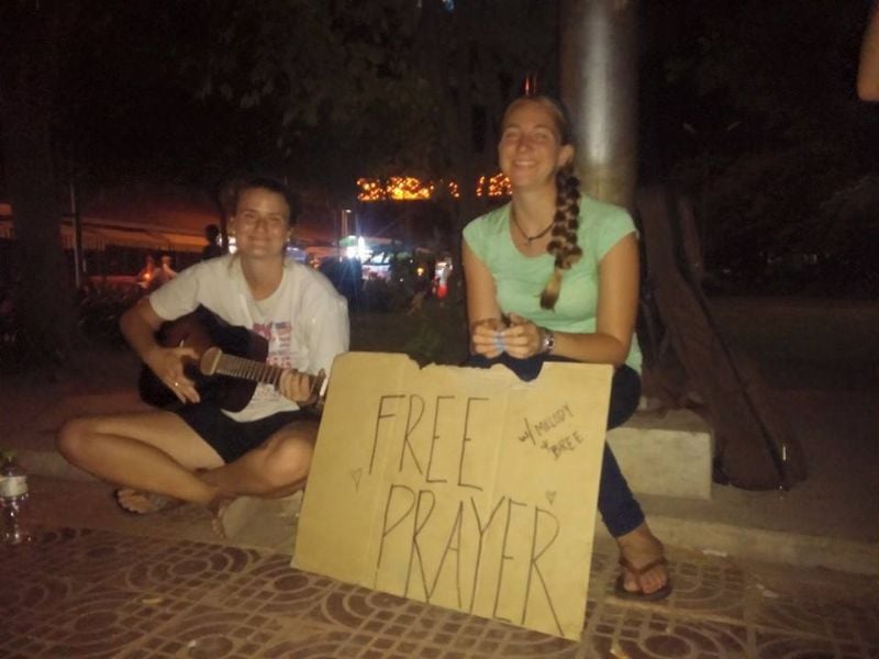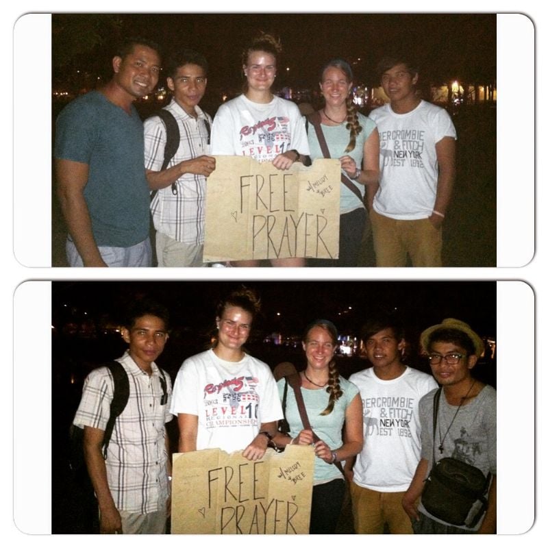 My second night of street ministry in Siem Reap occurred on the last night we were there. Bree had told me a day or two earlier that she had a vision of me and her, with a cardboard sign that said “Free Prayer” and me with my guitar. So on our last night in Siem Reap, I asked her, “Are we going to do this?” She agreed, and after our squad meeting, we set out on our mission. We found a good piece of cardboard on the street, and met a friend along the way who had a permanent marker. Then we walked around until we found a good spot to set up, and we sat down with our sign and I started playing. We just sang and worshiped for a while, people were giving us strange looks as they walked by, but no one was approaching us to ask for prayer. Bree asked a few people if they wanted free prayer, and they all said no. But shortly after, three guys stopped and asked us if we were with YWAM. We said, “No, we’re with the World Race” and they got super excited. They work at a YWAM base here in Cambodia and they had just finished hosting a World Race team in March. They prayed for us (in Khmer) and we prayed for them (in English). Then one of the guys said he felt like they should stay and worship with us a while. We ended up worshiping with them for about an hour and a half, and one of them got to have a long conversation about Jesus with a man who had been sitting nearby. It was so encouraging to meet these brothers of ours and instantly feel like family, because we have the same Father. They were encouraged to see us out on the streets, praying for people. It was a great night of mutual encouragement, as we worshiped God on the streets of Siem Reap, with our brothers from across the world.