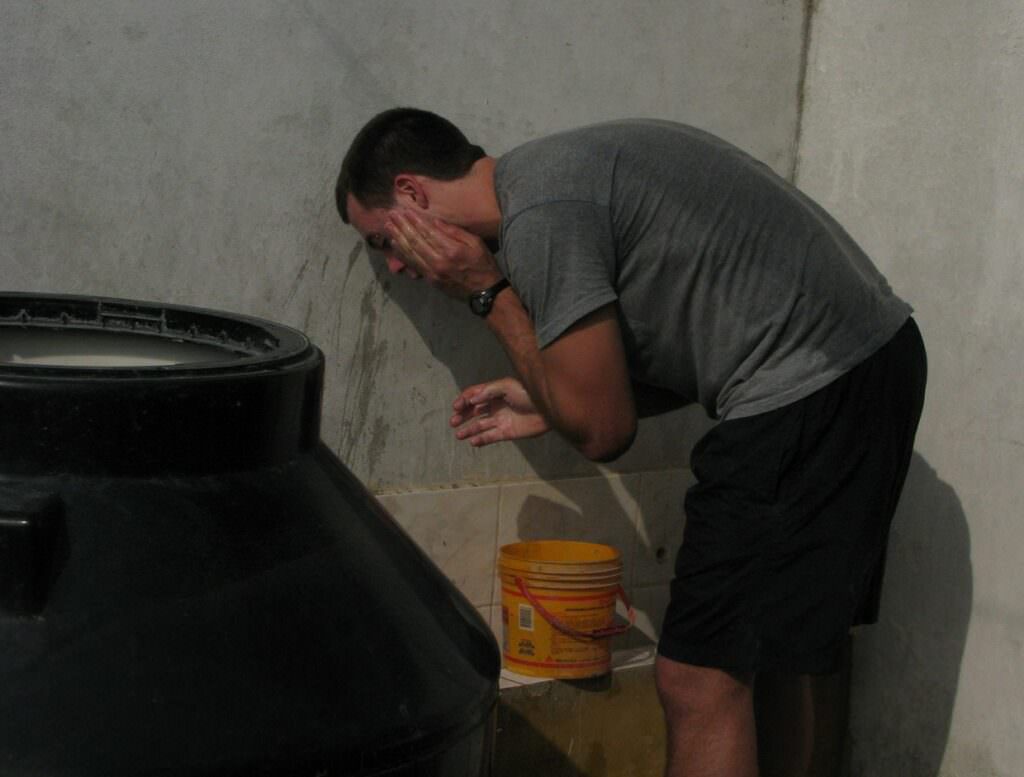 The big black tub on the left side kept our shower water. It was black so the water got warm during the day. The yellow bucket Robbie is using was for washing hands, flushing toilets, face washing, showers… At some point the big black container was cleaned out only to discover little worms lived in it. (!) They weren’t kidding about closing your mouth when you shower.
