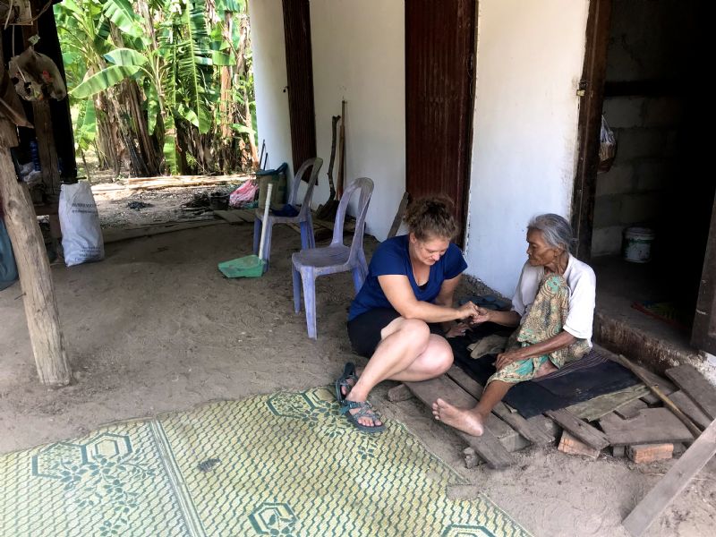 About a week ago, I met Niat and Ma, two little old ladies who lived together in a small cement building. Ma wore a purple shirt and limped about the yard, giving us orders in her language even though none of us could speak it. Niat sat on the stoop in a worn white t-shirt and green skirt. At over 90 years old, she can no longer see, and she depends on Ma to care for her.