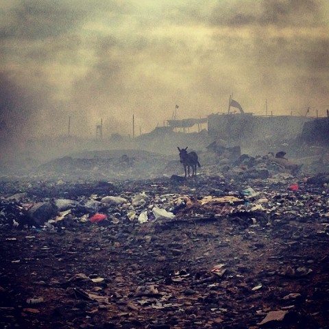 This is the dump in Trujillo, Peru. There is a community of people who live here and their homes are in the background. The smoke you see is burning garbage which is toxic as it's filled with burning plastic and many other things.