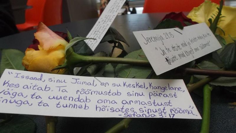 We decided on flowers. Everyone loves flowers, right? We copied bible verses in Estonian onto small slips of paper and wrote on the back, “Jeesus Armastab Sind” (“Jesus Loves You” in Estonian). We attached them to some roses we bought at the local flower shop and started to think about who we wanted to give them to. I gave my portion to some of the local girls we had met in the shops and cafes. They gratefully accepted them with a smile. One lady at a second hand shop we had visited who had been so helpful was so excited to get the flower and even talked to us for a bit and we were able to invite her to the church we were staying at. She said that it’s nice to be appreciated. She said normally no one paid her any mind or thanked her for anything.