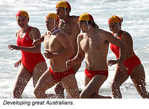 Australia has almost 112,600 Surf Life Savers, who collectively spend some 1.4 million hours patrolling Australian beaches, where they rescue approximately 10,000 people per year . (They’re like the real life Baywatch with the exception of David Hasselhoff and the cheesiness… Boys: don’t follow suit.. this is NOT a MODEST Swimsuit! 😉 )