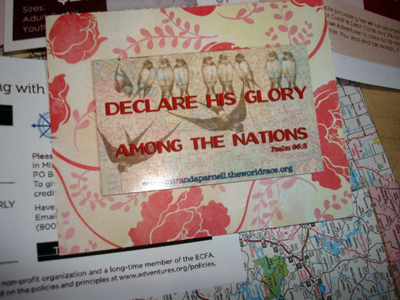 The Christian organization that I will be partnering with is called Adventures in Missions. I will be going on their program for college age adults, called the World Race. Although the program is inter-denominational, they have told me that I will be able to share the Sabbath and my beliefs with the people I meet.
